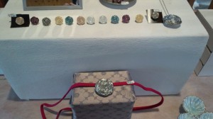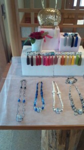 奥さんがデザインしたハンドメイドのネックレスやバックチャームです。世界で1つづつしかありません。